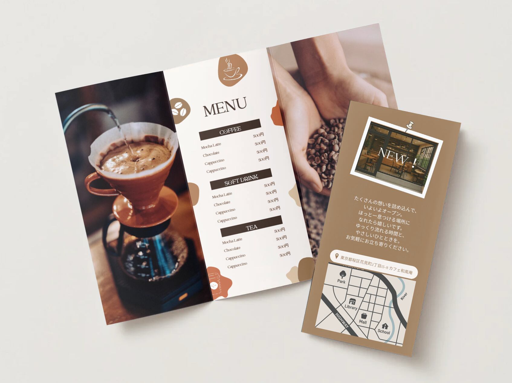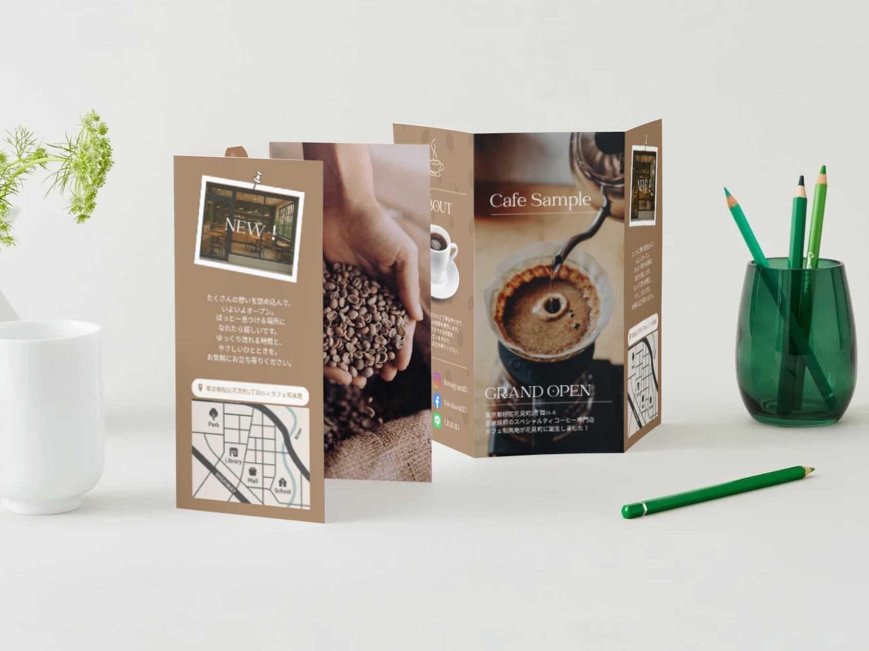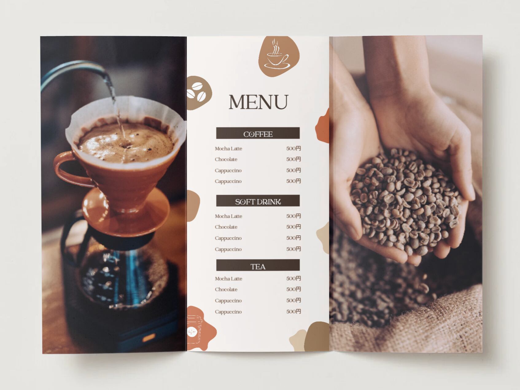 おしゃれなカフェ向け三つ折り冊子テンプレート(Canva対応)をご用意しました。