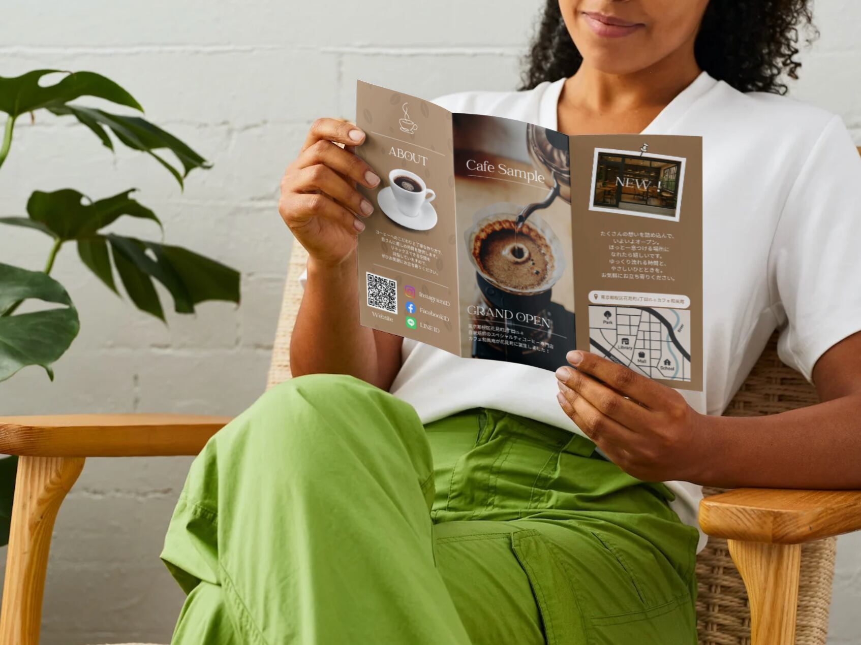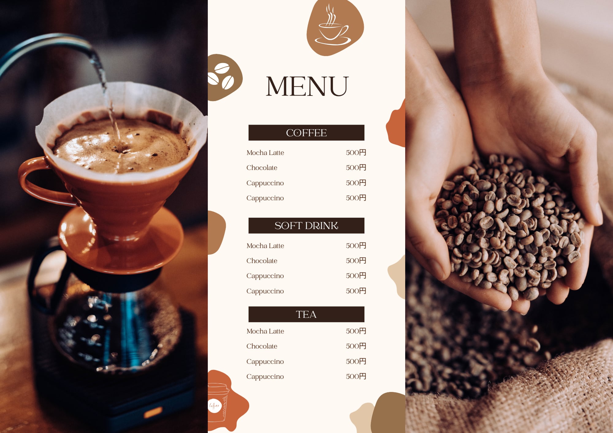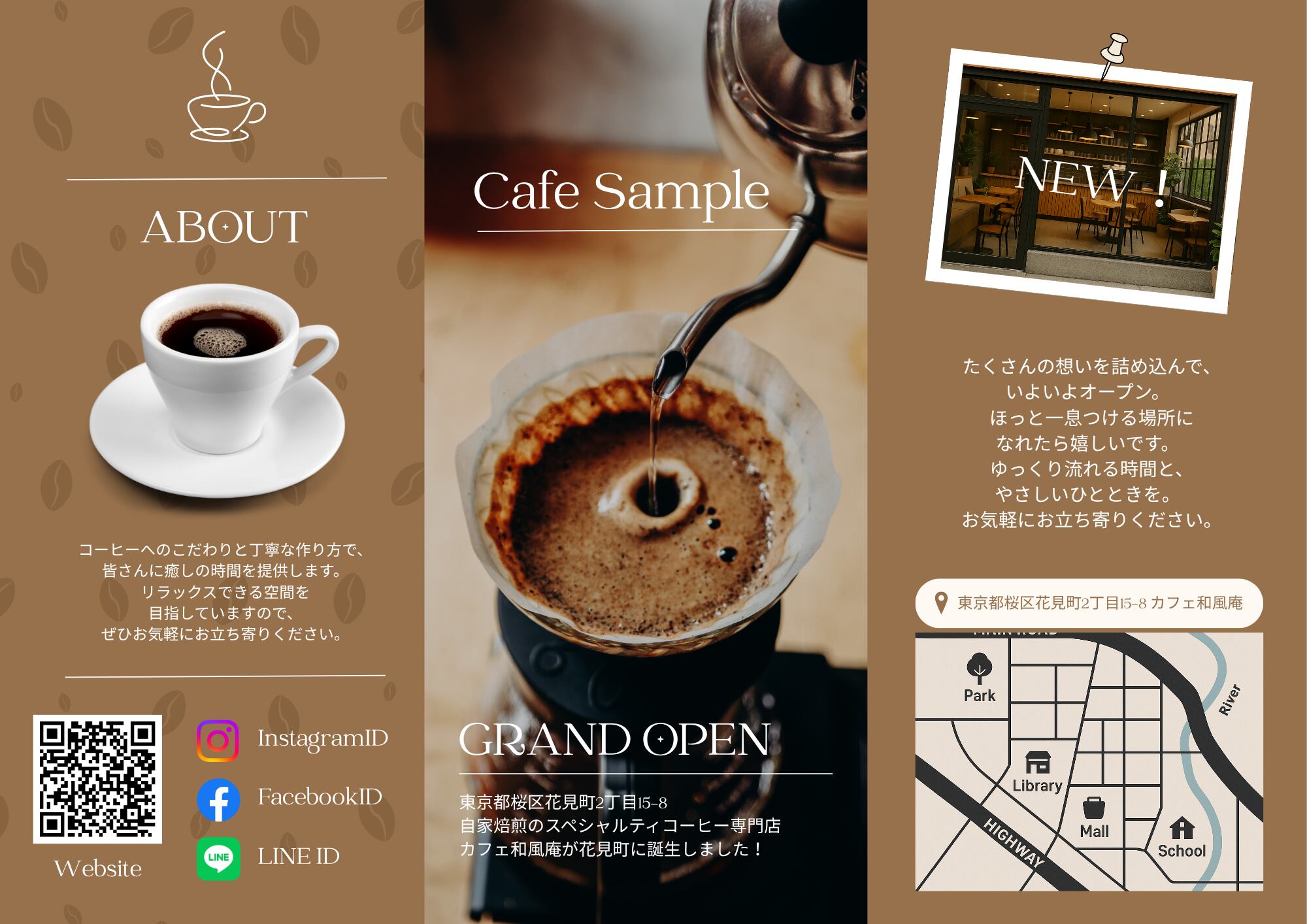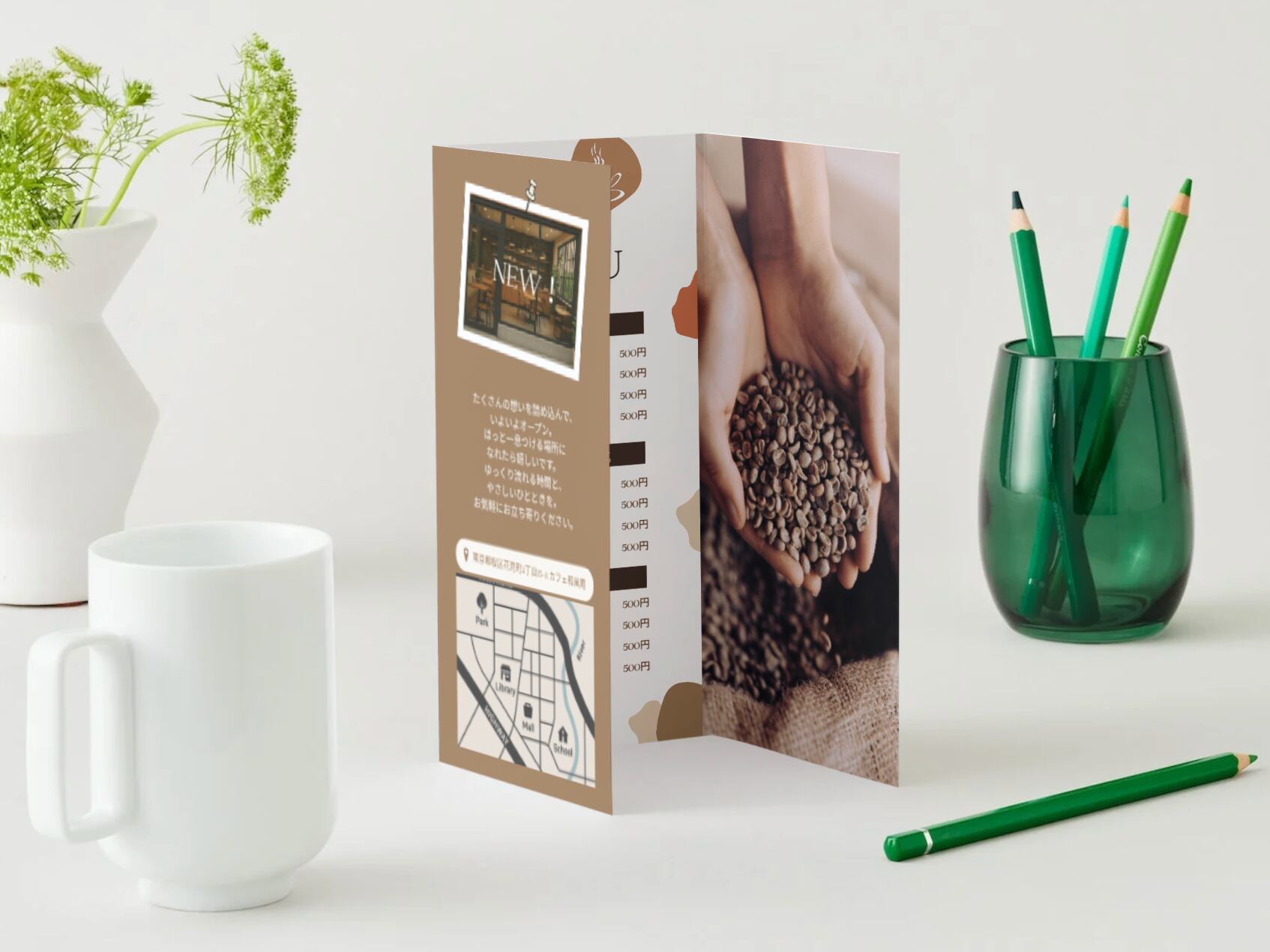 おしゃれなカフェ向け三つ折り冊子テンプレート(Canva対応)をご用意しました。