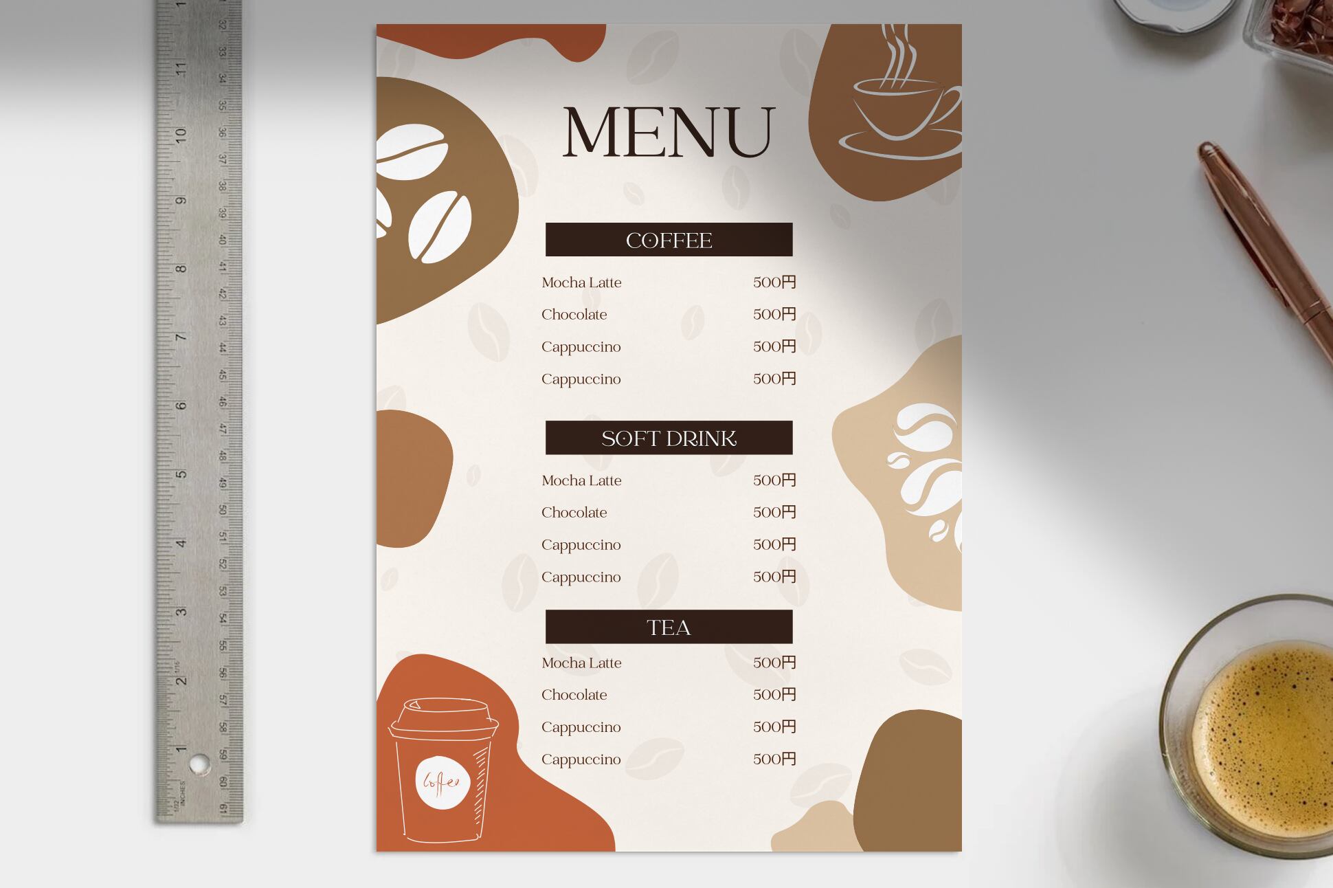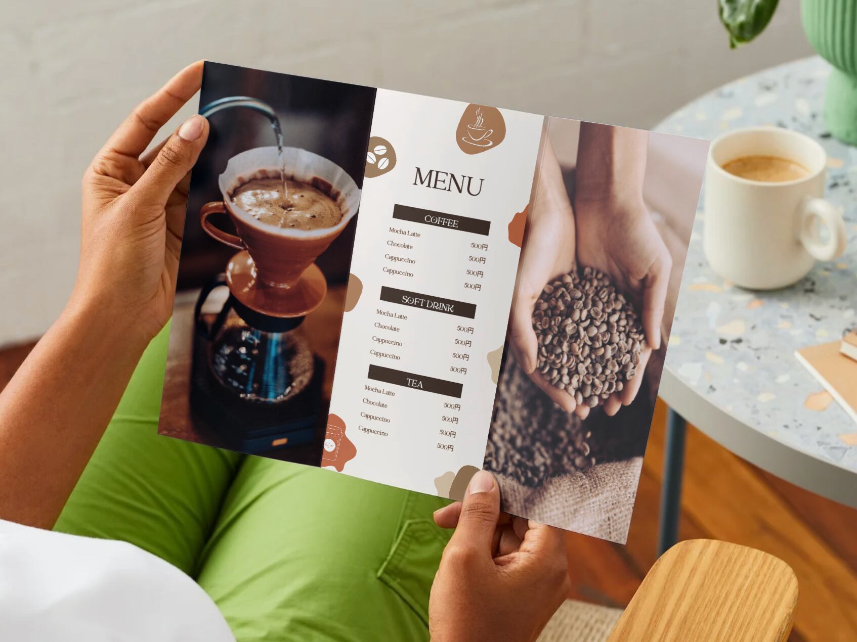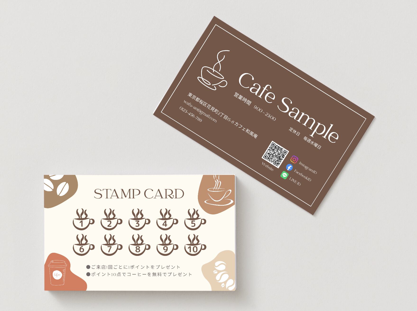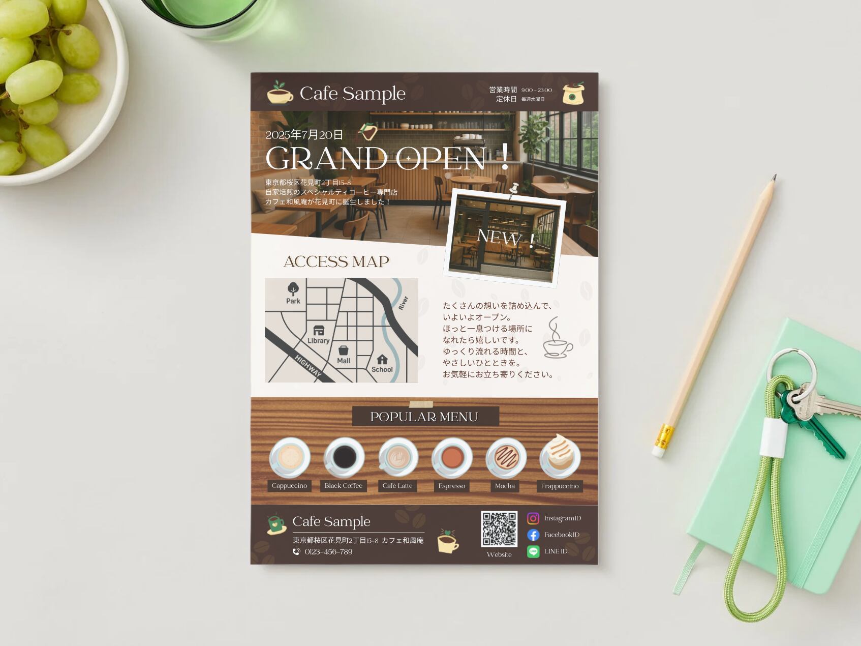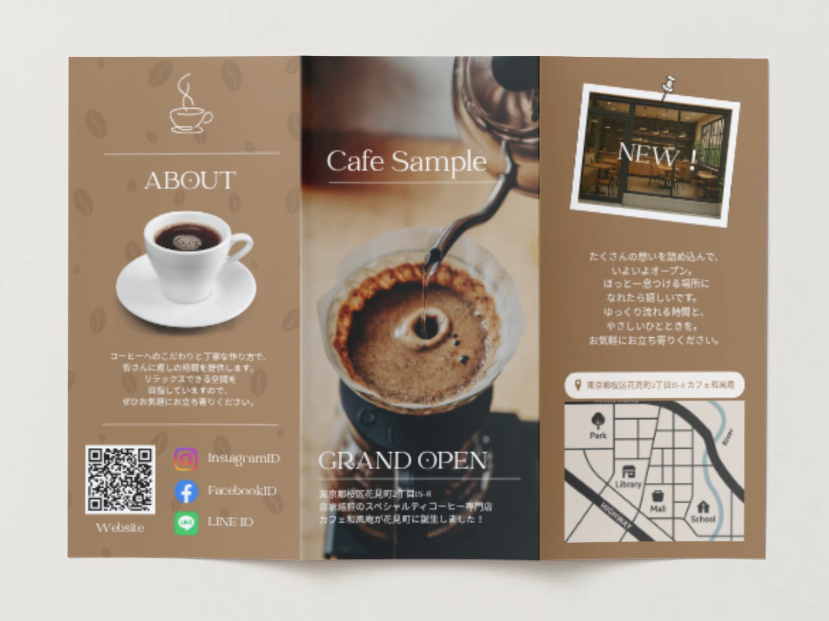 【Canva専用テンプレート】カフェオープン用6点セット|卓上ポップ・チラシ・名刺・スタンプカード・メニュー表・三つ折りパンフレット