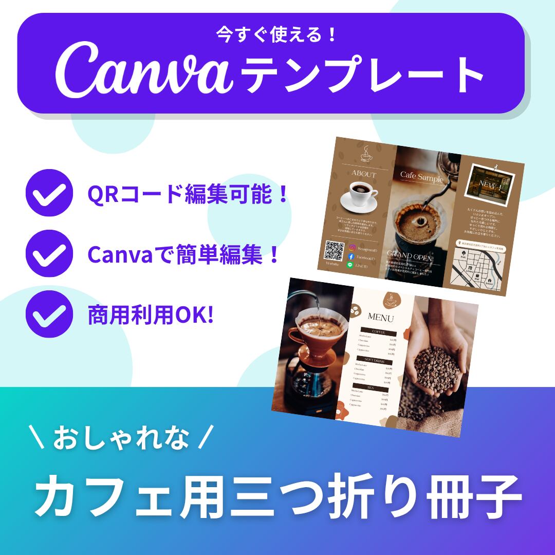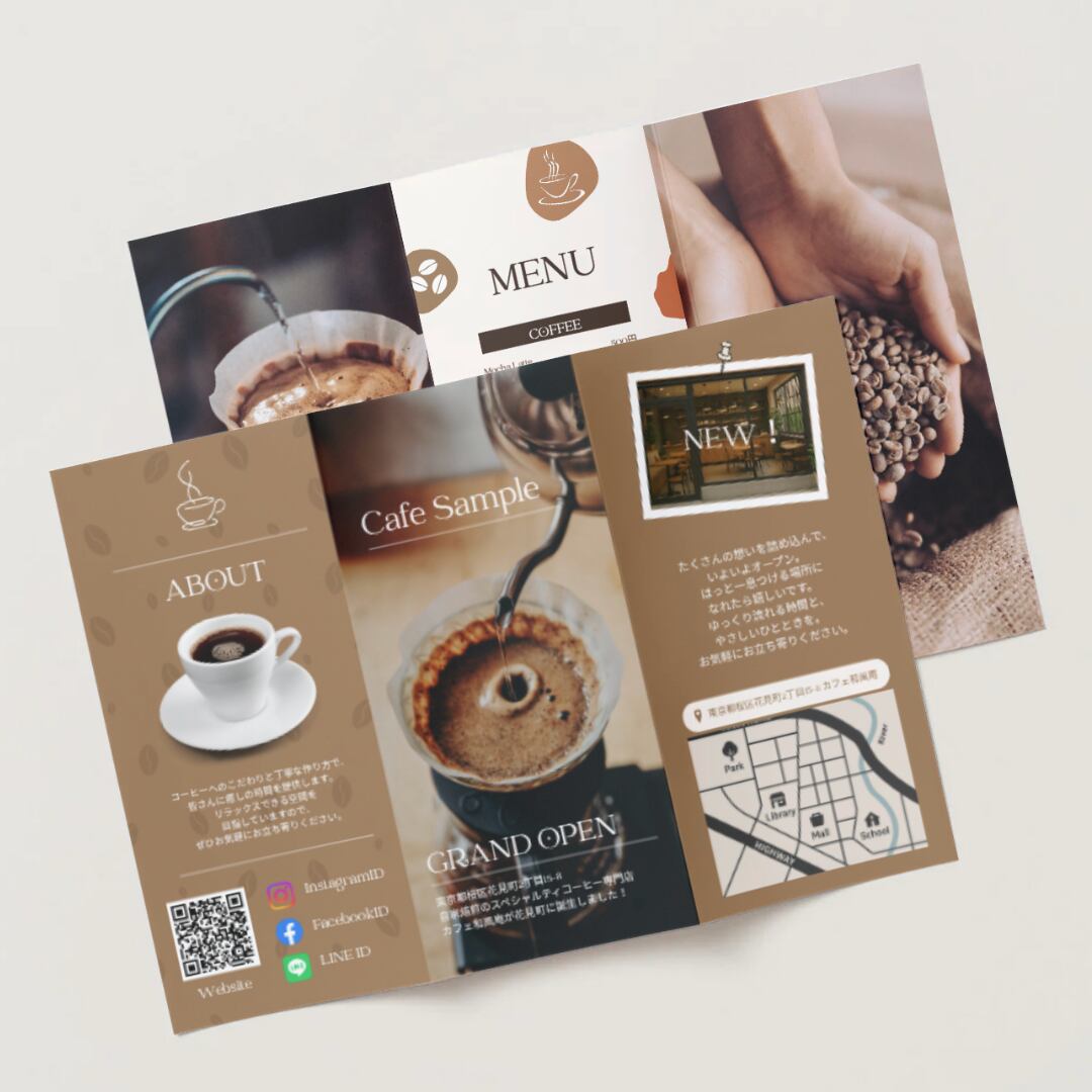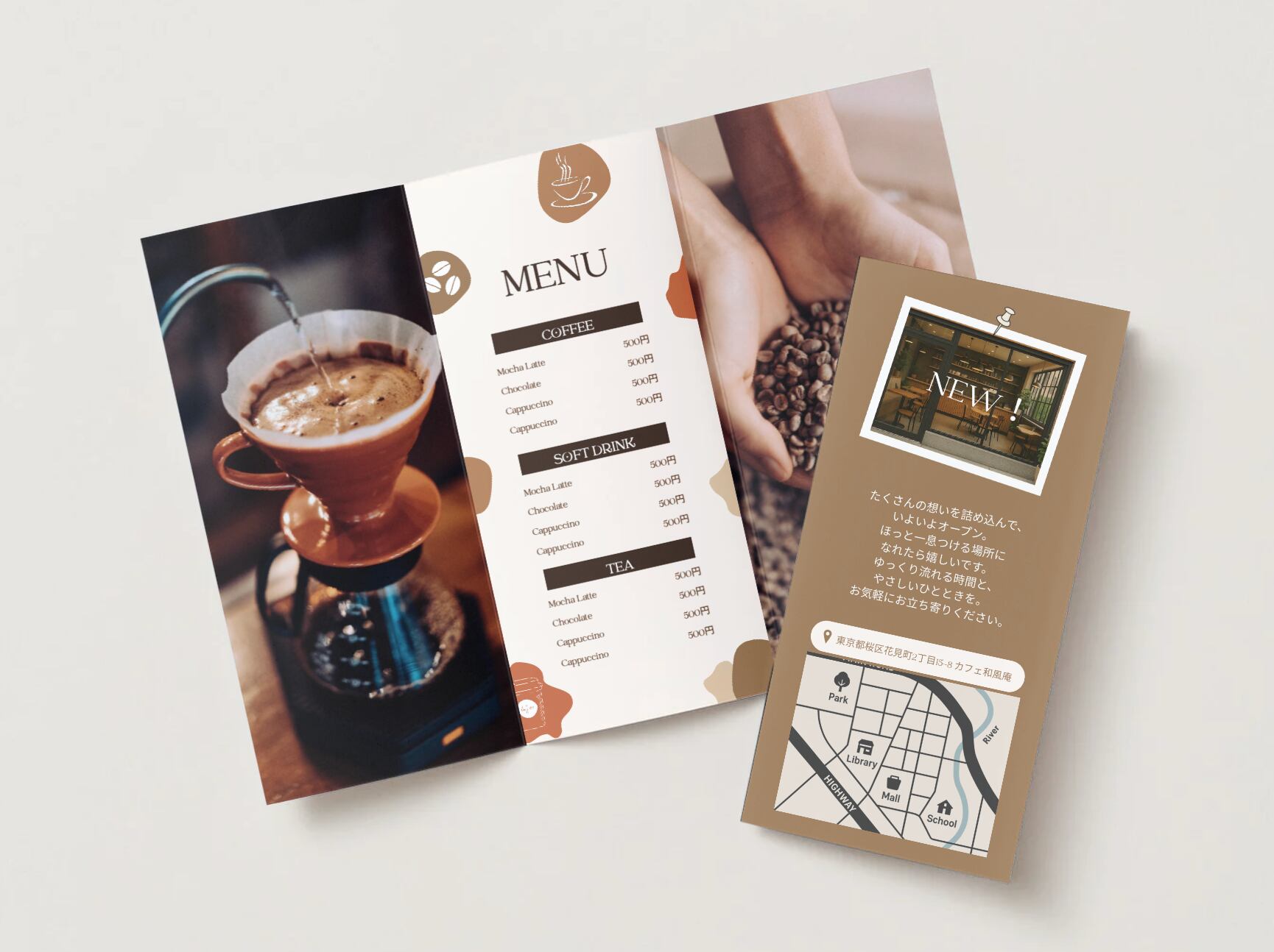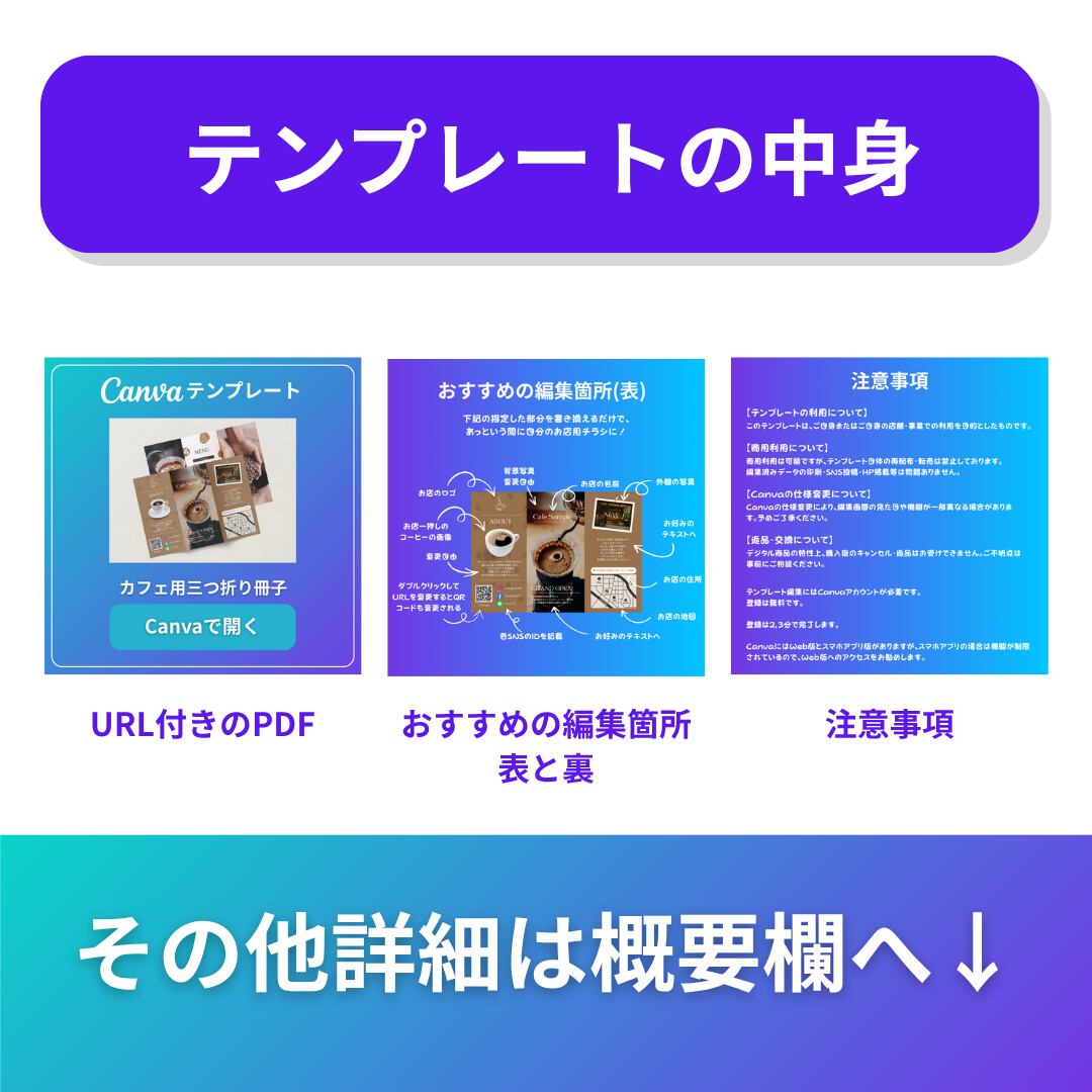 おしゃれなカフェ向け三つ折り冊子テンプレート(Canva対応)をご用意しました。